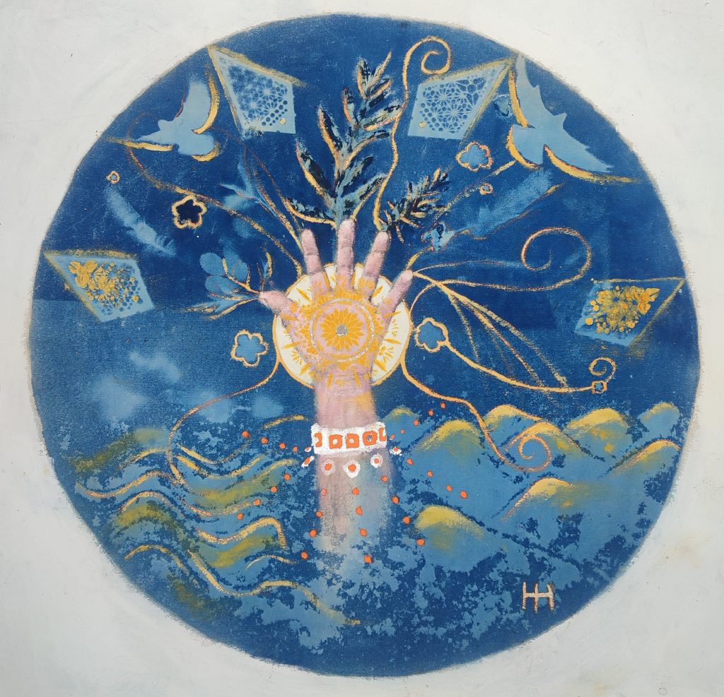 To honour the authenticity of this connection, the series is crafted using traditional, ceremonial materials. I work with henna, turmeric, and indigo, blending them with raw elements gathered directly from the Moroccan landscape: olive, mint, palm, sand, and rose. These are not just pigments; they are carriers of history and intention, grounding each piece in the soil and the stories of the people.